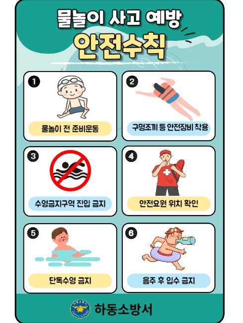 물놀이 사고를 예방하기 위해서는 ▲물놀이 전 준비운동 ▲구명조끼, 튜브 등 안전 장비 착용 ▲수영 금지구역 진입 금지 ▲안전요원 위치 및 위험지역 사전 확인 ▲건강 상태가 좋지 않을 때, 음주 후 입수 금지 ▲수영 능력 과시 또는 단독수영 금지 ▲갑작스러운 날씨 변화에 따른 물 불어남 주의 등 안전 수칙을 잘 준수해야 한다.