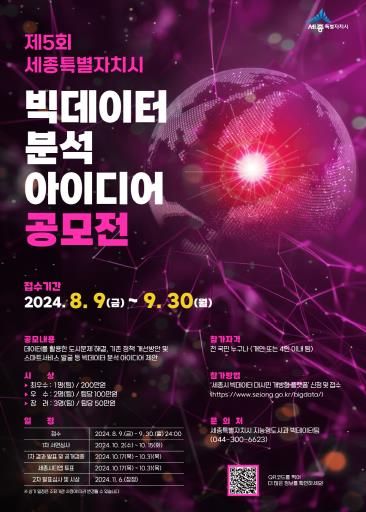 [경남도민뉴스] 세종특별자치시가 9일부터 내달 30일까지 ‘제5회 빅데이터 분석 아이디어 공모전’을 개최한다.