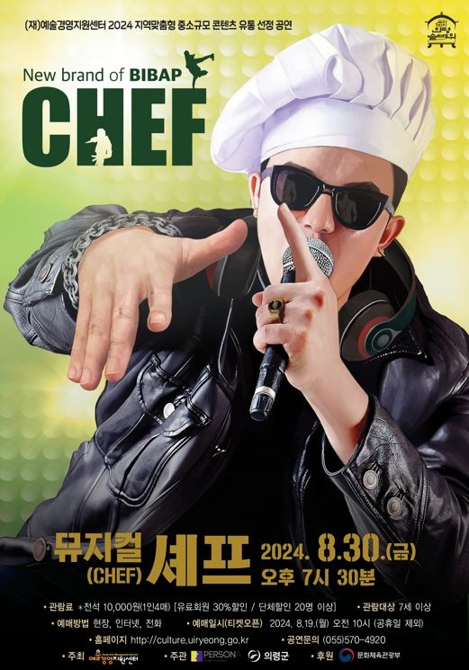 [경남도민뉴스] 의령군은 (재)예술경영지원센터 2024 지역맞춤형 중소규모 콘텐츠 유통 공모사업에 선정된 뮤지컬 ‘셰프’를 오는 30일 오후 7시30분 의령군민문화회관 공연장에서 개최한다고 밝혔다.