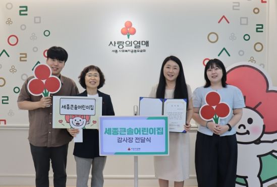 이희정 사무처장은 “원아들이 주변 이웃을 돕고 나눔의 손길을 건넨 경험을 간직하며 성장할 수 있게 지도해주시는 세종큰솔어린이집에 감사하다”며“세종사랑의열매에 전달해주신 소중한 성금은 관내 어려운 이웃과 아동에게 잘 전달하겠다” 고 말했다.
