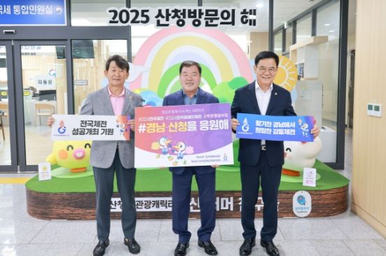 이승화 군수는 김수한 산청군의회 의장, 권희성 산청군체육회장과 함께 경남에서 열리는 양대 체전의 성공을 기원하고 도민과 군민의 관심을 요청했다.