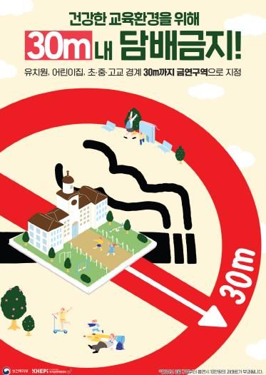 이에 따라 기존 어린이집, 유치원 시설 경계선에서 10m 이내였던 금연 구역이 30m 이내까지 확대되며 학교 시설 경계 30m 이내는 신규 금연 구역으로 지정됐다.