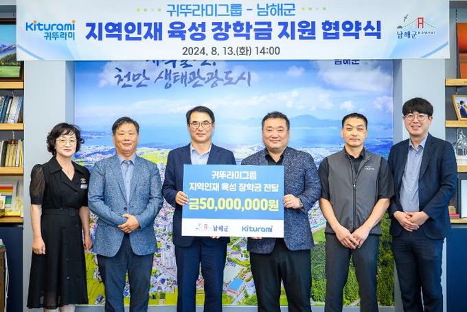 이날 협약식에는 김영준 귀뚜라미 부산지사장을 비롯하여 고재준 남해대리점 대표, 박재준 남해중앙대리점 대표 등 관계자 4명이 참석했으며, 관내 저소득가정 및 복지사각지대 학생들의 학업 장려를 위한 장학금 5,000만 원을 기탁했다.