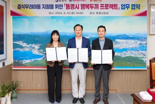 [경남도민뉴스] 통영시, 행복얼라이언스 사무국(행복나래 주식회사), 행복도시락사회적협동조합은 지난 13일 통영시장실에서 결식우려아동 발굴 및 지원을 위한'통영시 행복두끼 프로젝트'업무 협약을 체결했다.