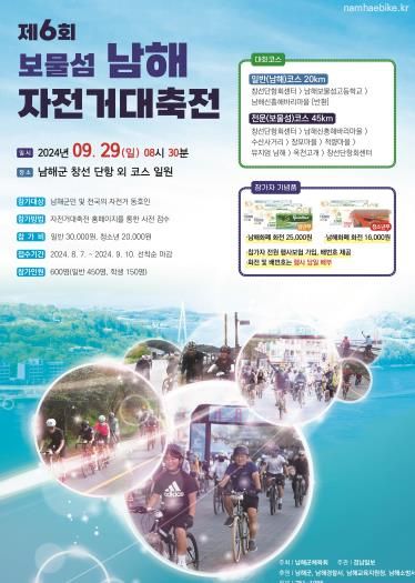 [경남도민뉴스=김부경기자] 남해군은 오는 9월 29일 창선단항회센터에서 남해군체육회가 주최하고 경남일보사가 주관하는 ‘제6회 보물섬 남해 자전거 대축전’이 열린다고 밝혔다.
