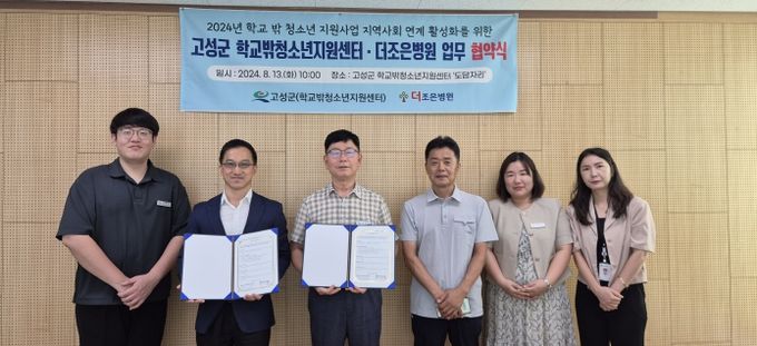 [경남도민뉴스=이형섭기자] 고성군 학교밖청소년지원센터는 지난 8월 13일 더조은병원과 학교 밖 청소년 건강검진 및 연계 지원을 수행하는 협력체계 강화를 위한 업무협약을 체결했다.