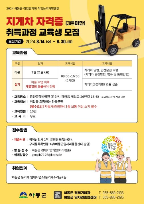 [경남도민뉴스=이형섭기자] 하동군이 ‘취업연계형 직업능력개발훈련’을 통해 지게차(3톤 미만) 면허와 독서지도사(2급) 자격증을 취득할 대상자를 오는 8월 30일까지 모집한다.