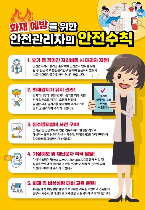 이에 소방서는 화재 예방을 위해 안전관리자가 준수해야 할 안전 수칙을 적극적으로 홍보했다. 주요 안전 수칙은 ▲장기간 자리 비움 시 대리자 지정 ▲화재감지기 유지관리 ▲침수 방지 설비 사전 구비 ▲기상예보 및 재난 문자메시지 적극 활용 ▲비상 상황 대비 교육 훈련 등이다.