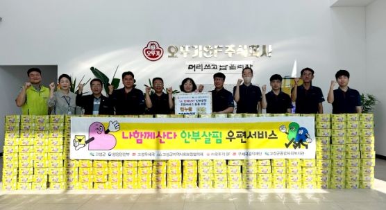 ‘나, 함께 산다’ 안부살핌 우편서비스는 행정안전부, 고성우체국, 고성군지역사회보장협의체, 오뚜기SF(주), 우체국공익재단, 경남사회복지공동모금회가 함께 고성군 내 중장년 1인 가구와 고립청년, 조손가구 등 주기적 안부 확인이 필요한 위기가구 100세대에 대하여 올해 11월까지 월 2회 복지택배 및 월 2회 복지등기를 발송하고 있다.