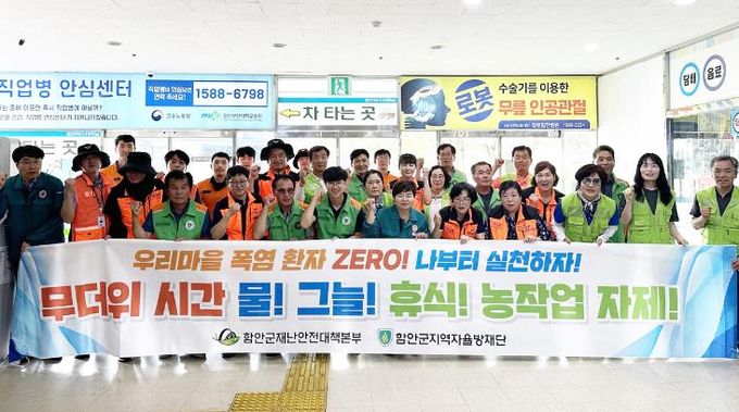 이날 방재단원과 공무원 30여 명은 유동 인구가 많은 함안버스터미널에서 군민들을 대상으로 열사병 예방을 위한 3대 기본수칙을 홍보했다.