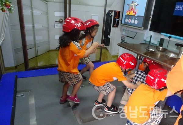 | ▲어린이집 원아들이 지진체험을 하고있다(사진=거창소방서) |