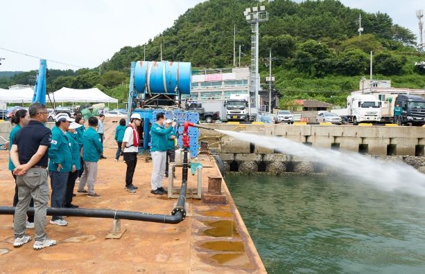 [경남도민뉴스=김부경기자] 통영시는 경남 해역 적조 예비특보 발표 및 적조 생물 성장에 적당한 해양환경이 지속적으로 유지되고 있어 적조 발생에 선제적으로 대응하고자 지난 19일 관공선 부두에서 적조방제용 황토살포기 시범운영을 실시했다.