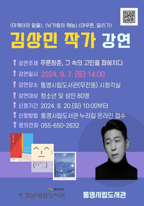 [경남도민뉴스=김부경기자] 통영시 통영시립도서관은 경남대표도서관에서 주최하는'2024년 북돋움 축제'공모사업에 선정돼 9월 7일(토) '김상민 작가 강연'을 개최한다.