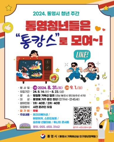 통영청년캠프는 8. 31. 40명, 9. 1. 40명 각각 오후 1시부터 오후 9시까지 평림동 거북선캠프(통영시 평인일주로 478번지)에서 해양레저활동(SUP, 씨카약 등), 액티비티 보트체험, 요리대회(조별 요리왕 선발대회), 풍등띄우기, 투나잇페스타 등의 내용으로 진행될 예정이며 참가비는 무료이다.