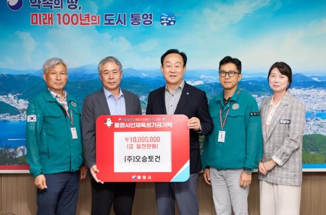 [경남도민뉴스=김부경기자] ㈜오승토건은 지난 20일 통영시청 시장실을 방문해 지역 인재육성을 위한 인재육성기금 1,000만원을 기탁했다.