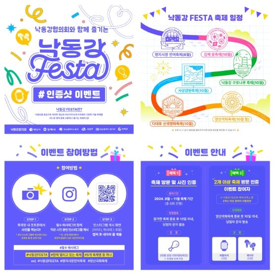 낙동강 FESTA의 일환으로 ‘함께하는 낙동강 FESTA SNS 인증샷 이벤트’가 8월 27일 명지전어축제를 시작으로 10월 말 시작하는 양산국화축제까지 6개 축제 장소에서 총 6회 진행되며, 생생한 축제 현장에서 찍은 인증 사진을 SNS에 올리면 추첨을 통해 2만원 상당의 기프티콘을 제공한다.