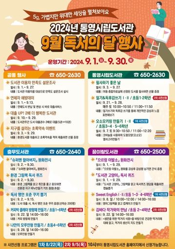 [경남도민뉴스=김부경 기자] 통영시 시립도서관은 9월 독서의 달을 맞아 “5g, 가볍지만 위대한 세상을 펼쳐보세요” 라는 주제로 다채로운 독서 문화프로그램을 운영한다.