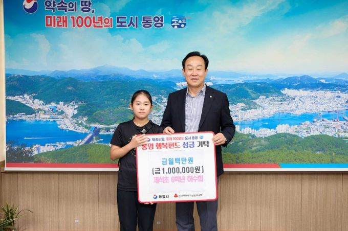 [경남도민뉴스=김부경 기자] 지난 10일 KBS 전국노래자랑 통영시편에 참가해 최우수상을 수상한 하수희 학생(제석초 6학년)이 시상금 일부(100만원)를 어려운 이웃을 위해 써달라며 통영시(시장 천영기)에 기탁했다.