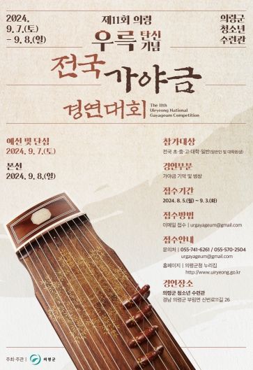 [경남도민뉴스=이상민 기자] 의령군이 주최하고 문화체육관광부가 후원하는 제11회 의령 우륵 탄신기념 전국가야금경연대회가 오는 9월 7일부터 8일까지 이틀간 의령군 부림면 의령군청소년수련관에서 개최된다.