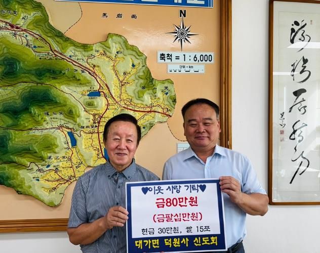 대가면 갈천리에 위치한 사찰 덕원사는 10년 넘게 물품을 기탁하며 이웃사랑을 실천하고 있으며, 작년에 이어 올해도 명절을 맞이하여 신도들과 십시일반 모은 성금으로 주변의 어려운 이웃들에게 온정을 나누고 있어 지역사회에 귀감이 되고 있다.