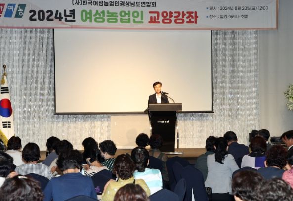 [경남도민뉴스=나희준 기자] (사)한국여성농업인 경상남도연합회는 23일 호텔아리나에서 안병구 밀양시장, 장병국 도의원, 경상남도 여성농업인 등 130여 명이 참석한 가운데 ‘2024년 여성농업인 교양강좌’를 개최했다고 밝혔다.