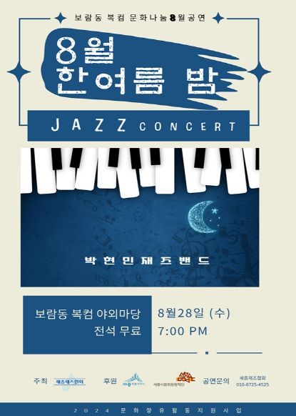 8월 공연은 세종문화관광재단이 후원하는 문화향유활동지원사업 일환으로 진행되며 세종재즈협회 박현민 재즈밴드가 무료로 공연을 선보인다.