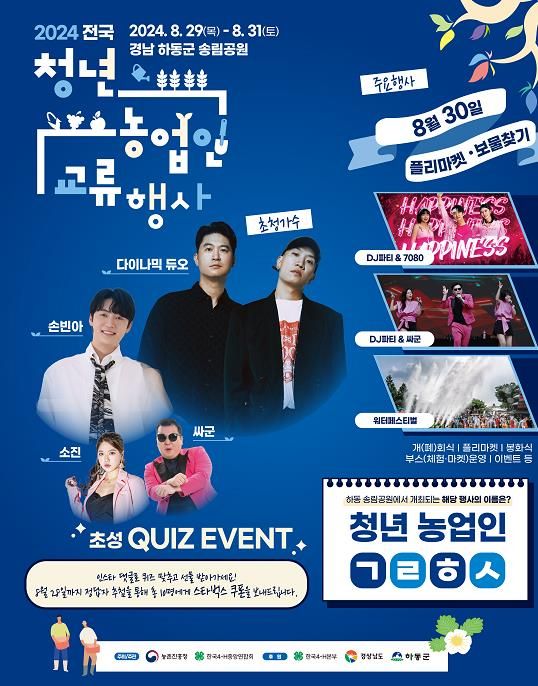 [경남도민뉴스=이형섭 기자] ‘2024 전국 청년농업인 교류행사’가 오는 8월 29일에서 31일 하동읍 송림공원에서 열린다.