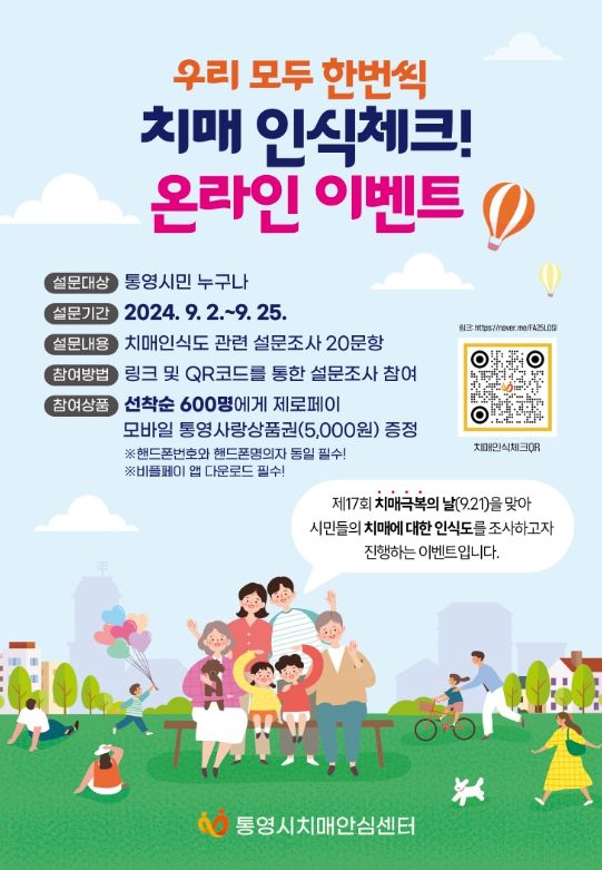 이에 통영시는 시민의 치매인식도를 알아보는 온라인 이벤트는 통영시민 누구나 참여가능하며, 9월 2일부터 QR코드 또는 링크(https://naver.me/FA25LOSI)로 접속해 20문항의 설문으로 진행되며 참여자에게는 소정의 상품이 지급된다.