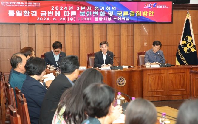 [경남도민뉴스=나희준 기자] 민주평화통일자문회의 밀양시협의회는 28일 시청 소회의실에서 안병구 밀양시장, 자문위원 등 40여 명이 참석한 가운데‘통일환경 급변에 따른 북한 변화 및 국론결집 방안’을 주제로‘2024년 3분기 정기회의’를 개최했다.