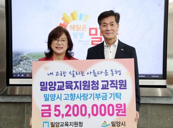 이번 기부는 시와 교육지원청이 지역 내 교육관계자를 대상으로 고향 사랑 기부 취지와 혜택, 참여 방법 등을 적극적으로 홍보해 밀양교육지원청과 관내 12개 학교 52명의 직원이 동참해 이뤄졌다.