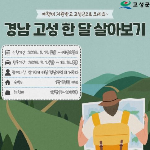 [경남도민뉴스=이형섭 기자] 고성군은 8월 19일부터 ‘2024년 경남 고성 한 달 살아보기 프로그램’ 3차 참가자를 모집하고 있다.