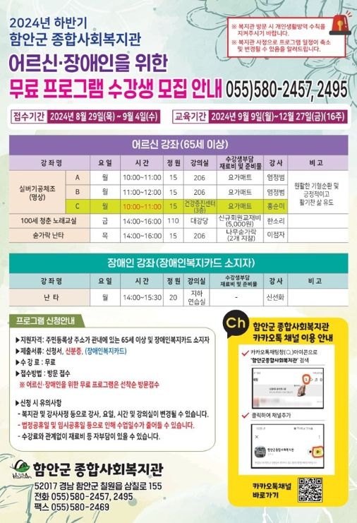 자세한 사항은 함안군 종합사회복지관으로 문의하거나 카카오톡 채널에서 ‘함안군종합사회복지관’을 추가하면 정보를 확인할 수 있다.