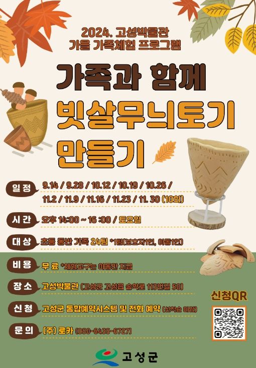 군 관계자는 “이번 체험프로그램을 통해 새로운 고성의 역사를 알리고, 참여하는 아이들과 가족들이 신석기시대 토기와 친숙해지는 계기가 되기를 바란다”라며 “앞으로도 고성의 역사문화를 다채롭게 체험할 방법을 지속해서 고민하겠다”라고 전했다.