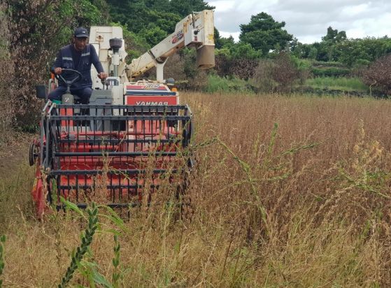 [경남도민뉴스=경남도민뉴스 기자] 제주특별자치도 농업기술원 동부농업기술센터는 최근 낟알이 여물어도 꼬투리에 잘 달려있는 신품종 참깨 ‘하니올’을 콤바인으로 수확했다고 밝혔다.