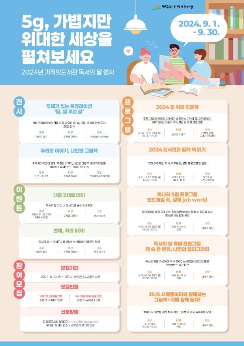 [경남도민뉴스=경남도민뉴스 기자] 제주시기적의도서관은 9월 독서의 달을 맞아 ‘5g, 가볍지만 위대한 세상을 펼쳐보세요’라는 주제로 어린이와 시민 모두 함께 즐길 수 있는 다채로운 독서 행사를 운영한다.