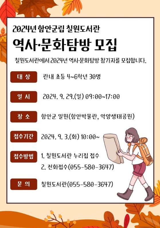 [경남도민뉴스=이상민 기자] 함안군립 칠원도서관은 관내 초등학생 4~6학년을 대상으로 하는 ‘2024년 역사·문화탐방’ 프로그램 참가자를 오는 9월 3일(화)부터 모집한다고 밝혔다.