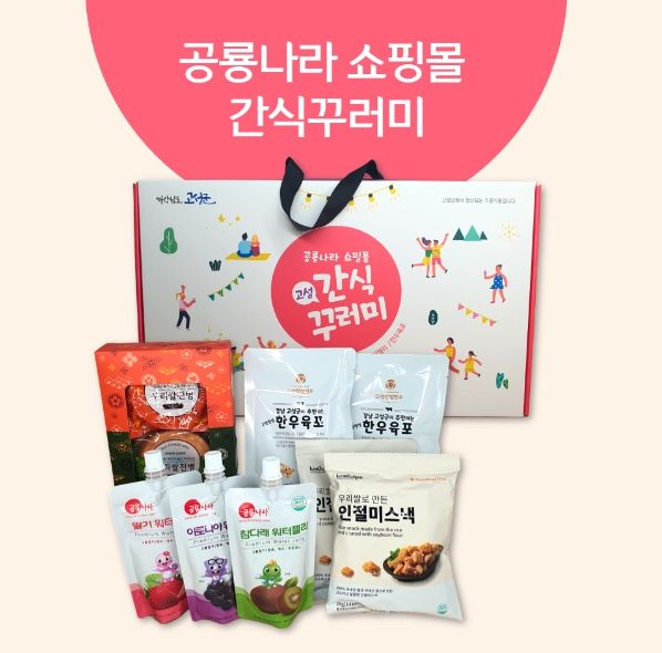 간식꾸러미(판매가 20,000원)는 우리쌀 전병 * 6개, 인절미스낵 * 2개, 육포 200g *2개, 워터젤리 100g *3개로 구성된다.