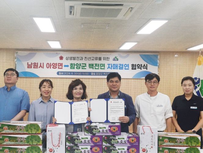 [경남도민뉴스=장광동 기자] 경남 함양군 백전면(면장 조영화)과 전북 남원시 아영면(면장 이금연)은 8월 30일 백전면사무소에서 양 기관 면장과 직원 등 10여 명이 참석한 가운데 자매결연 협약을 체결했다.