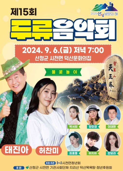 시천면청년회가 주관하는 올해 음악회는 지역 전문 MC 손병국의 사회로 태진아, 허찬미, 한보라, 하지하, 양미경, 박서희, 최효동, 이태환 등의 신명나고 열정적인 무대와 형형색색의 화려한 불꽃놀이가 펼쳐진다.