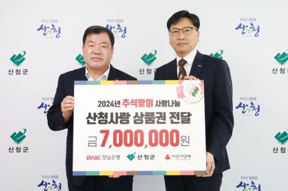 황철완 BNK경남은행 산청지점장은 “추석 명절을 앞두고 소외된 이웃들이 조금이나마 따뜻한 명절을 보내길 바라는 마음에서 기탁하게 됐다”며 “앞으로도 다양한 사회공헌 활동을 통해 이웃사랑 나눔 실천에 앞장서겠다”고 전했다.