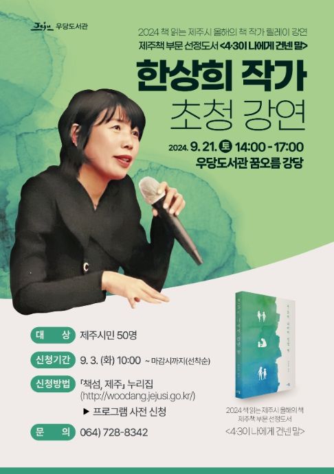 [경남도민뉴스=경남도민뉴스 기자] 제주시 우당도서관은 UN 세계 평화의 날을 맞아 2024년 책 읽는 제주시 올해의 책 제주책 부문에 선정된 도서 '4·3이 나에게 건넨 말'을 집필한 한상희 작가를 초청해 강연을 개최한다.