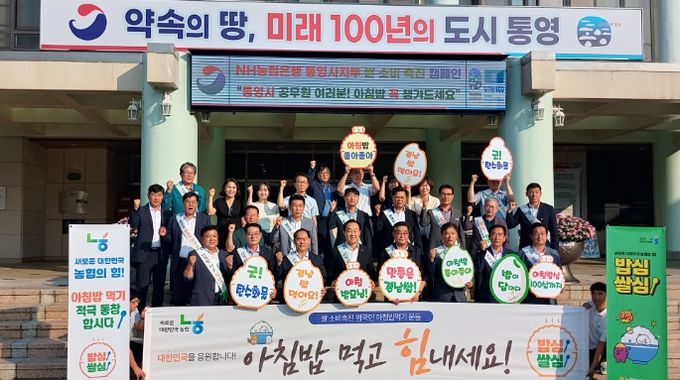 농협통영시지부(지부장 차용선)는 통영시청 1청사 및 2청사에서 통영시장, 통영시의회 의장, 통영시부시장, 통영시청 실·국·소장, 관내 농·축협조합장 등 30여명이 모여 통영지역 쌀 소비 촉진 결의대회에 이어 '밥심/쌀심 리후렛'과 우리 쌀로 만든 가공품(쌀국수)을 출근하는 통영시 1천여 공무원에게 나눠주며 캠페인을 진행했다.
