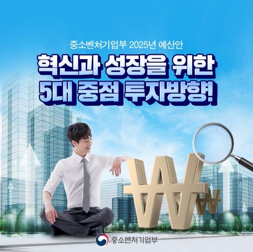 중소기업벤처부는 ①혁신 생태계 조성, ②글로벌화, ③지역·제조혁신, ④소상공인·상권 활력, ⑤지속 가능한 성장 등 5대 중점 투자 분야를 중심으로 2025년 예산안을 편성했습니다.