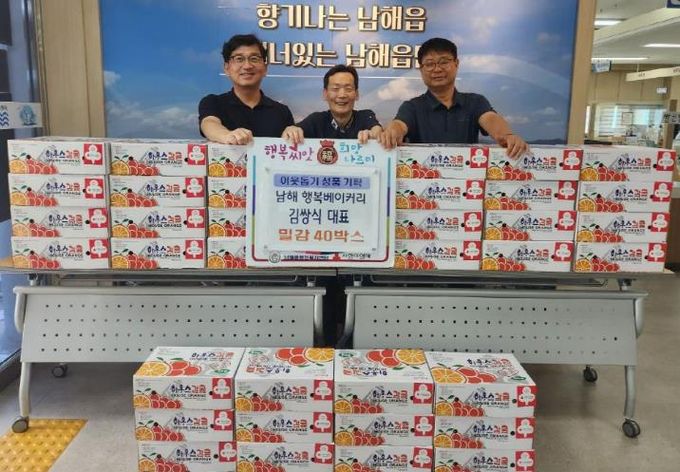 [경남도민뉴스=김부경 기자] 남해읍 행정복지센터는 2일 ‘행복 베이커리’를 운영하는 김쌍식 대표가 관내 경로당 어르신들에게 전달해 달라며 감귤(5KG) 40박스(140만원 상당)를 기탁했다고 밝혔다.