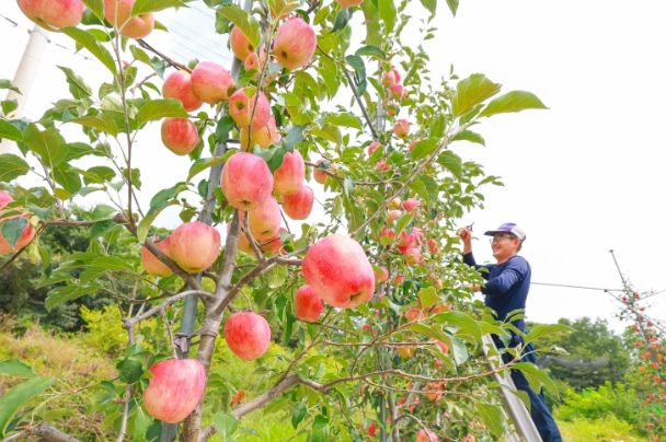산청 황매산 사과는 큰 일교차와 맑은 공기로 당도가 높고 아삭한 식감이 특징이다.