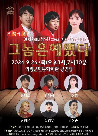 [경남도민뉴스=이상민 기자] 의령군은 자체 기획공연인 연극 ‘그놈은 예뻤다’를 9월 16일 오후 3시, 7시 30분에 의령군민문화회관 공연장에서 선보인다고 밝혔다.