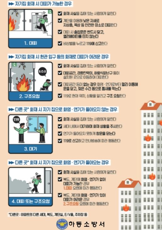 하동소방서에 따르면 공동주택 화재 발생 시 무조건적인 대피보다는 불길과 연기의 유무를 신중히 살피고 판단한 후 행동하는 것이 중요하다.