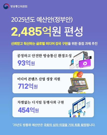 [경남도민뉴스=경남도민뉴스 기자] 방송통신위원회는 2025년도 예산으로 총 2,485억 원을 편성하여 국회에 제출했습니다.