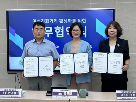 [경남도민뉴스=도문호 기자] 세종시사회서비스원에서 운영하는 세종여성플라자는 2일 새롬동 주민자치회, 세종여성새로일하기센터와 새롬동 여성친화거리 활성화를 위한 업무협약을 체결했다.