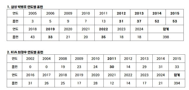 [경남도민뉴스=경남도민뉴스 기자] 삼성 박병호와 KIA 최형우가 KBO 리그 400홈런 달성을 눈 앞에 두고 있다. 398홈런의 박병호와 394홈런의 최형우는 400홈런까지 각각 홈런 2개, 6개를 남겨둔 가운데, 전 삼성 이승엽과 SSG 최정, 두 명만이 가지고 있는 KBO 리그 400홈런 고지에 먼저 달성하는 선수는 역대 3번째 선수가 된다.